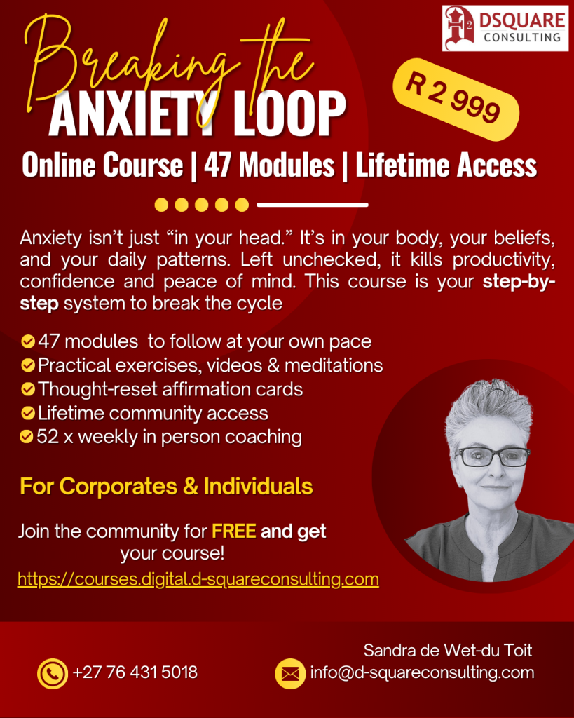 The Breaking the Anxiety Loop course is a comprehensive 47-module online program designed to help women identify, understand, and break free from anxiety patterns that are holding them back in work and life. This course takes you step-by-step through practical tools, mindset shifts, and resilience strategies that tackle anxiety at its core. Whether it’s workplace stress, imposter syndrome, or constant overthinking, this course equips you to reclaim control over your mind, body, and emotions. This course is available in the DSquare Online Community.